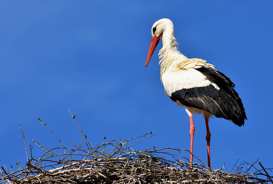 La cigüeña es un huésped frecuente por aquí. Anidan de buen grado en el techo de la escuela de música, o en los puntos altos de los alrededores y más a menudo en el poste eléctrico frente a la iglesia; cebando allí a sus polluelos.